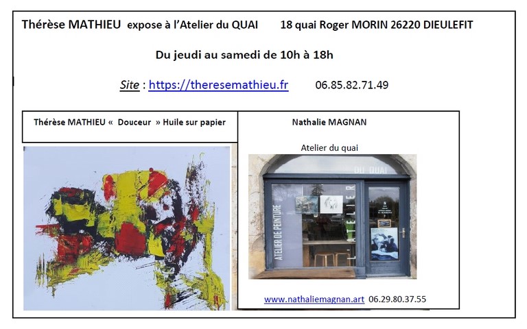 L’atelier galerie idéalement situé à DIEULEFIT, au bord du jabron en face du parking de la gare vous attend toute l’année et vous séduira par son espace épuré, modulable et contemporain.